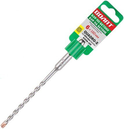 Бур (сверло) SDS-plus 6х100х160 мм ВОЛАТ Quadro-x (83006-160) служит для сверления отверстий в бетоне, кирпичной кладке, камне, граните. Двойной крестообразный наконечник облегчает процесс сверления и образует более ровное (правильной формы) отверстие в обрабатываемом материале. Бур используется в перфораторах с типом крепления SDS-plus. Тип пластины: крестовая. Материал пластины: твердосплавная с победитовым наконечником YG8C. Марка стали: легированная сталь 40Х. Упаковка: индивидуальный подвес с отверстием под крюк.