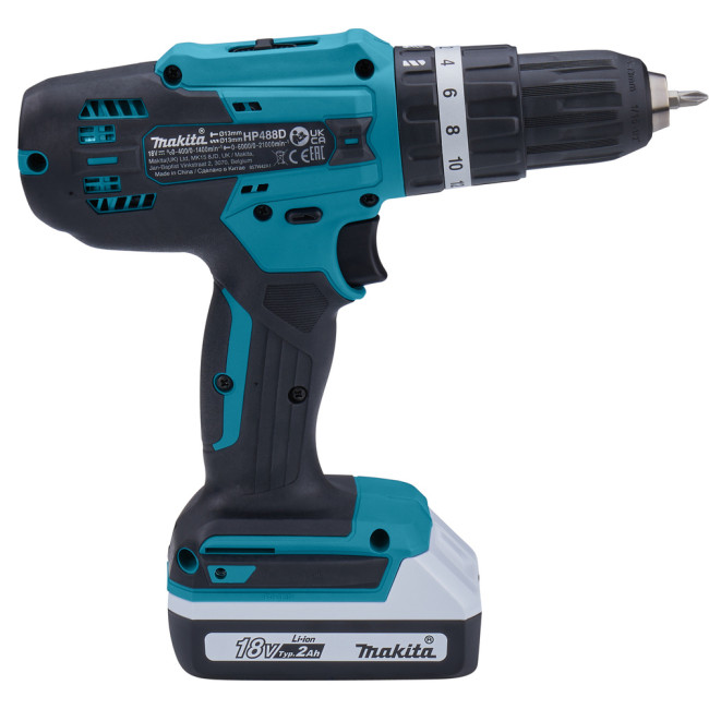Дрель-шуруповерт аккумуляторная ударная MAKITA HP 488 DWAE (HP488DWAE) — двухскоростная ударная дрель-шуруповерт компактного размера. Крутящий момент 42 Нм. Электронная регулировка оборотов, электрический тормоз, реверс. Ударный механизм для работы с твердыми материалами. Дрель-шуруповерт подходит для сверления отверстий в стали, дереве, в твердых материалах и для работы с крепежом.