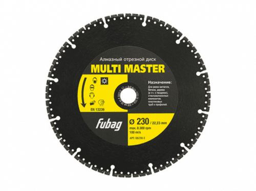 Круг алмазный 230х22,2 мм FUBAG Multi Master (88230-3) применяется для сухой резки. Алмазный отрезной диск с сегментной режущей кромкой диаметром 230 мм и посадочным отверстием 22.2 мм рекомендован для резки металла, бетона, дерева (в том числе и с гвоздями), стекловолоконных композитов, пластиковых труб и профилей.