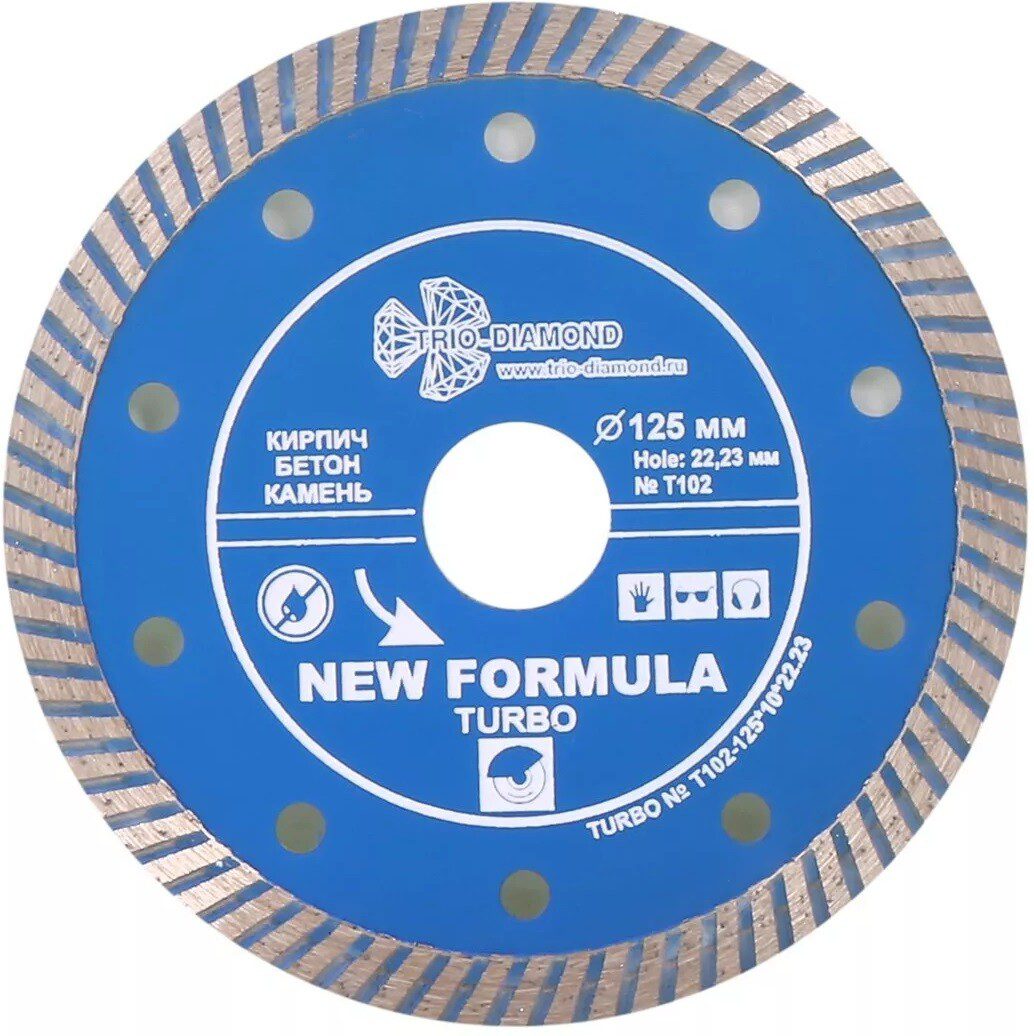 Круг алмазный 125х22,23 мм TRIO-DIAMOND Turbo (T102) предназначен для резки широкого спектра твердых и среднеабразивных материалов (бетона, бордюрного камня, кирпича, тротуарной плитки, твердого песчаника, гранита). Диск с рифленой кромкой имеет более чистый и аккуратный, по сравнению с сегментными дисками, рез. За счет турбированной кромки увеличивается скорость реза, отверстия в теле диска способствует лучшему охлаждению и продлевают срок службы. Подходит как для сухого, так и для мокрого реза. Технология производства: холодное проессование.