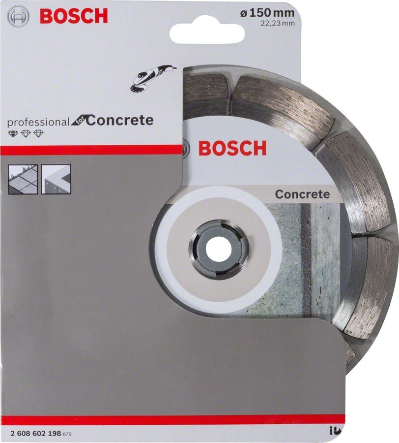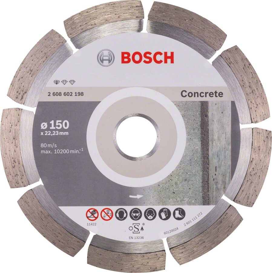 Круг алмазный 150х22 мм BOSCH Standard for Concrete (2608602198) — недорогой алмазный отрезной круг — оптимальное решение для обработки бетона. Алмазные режущие сегменты, наносимые методом термической опрессовки. Может использоваться как оснастка для углошлифмашин, бороздоделов и прочего совместимого инструмента.