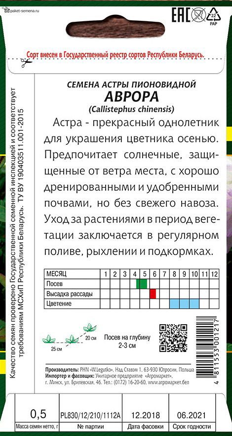 Семена астры пионовидной Аврора LEGUTKO 0,5 г (14565) — прекрасный однолетник для украшения цветника осенью. Предпочитает солнечные, защищенные от ветра места, с хорошо дренированными и удобренными почвами, но без свежего навоза. Уход за растениями в период вегетации заключается в регулярном поливе, рыхлении и подкормках.Рекомендуется для клумб, рабаток, массовых посадок и для срезки.