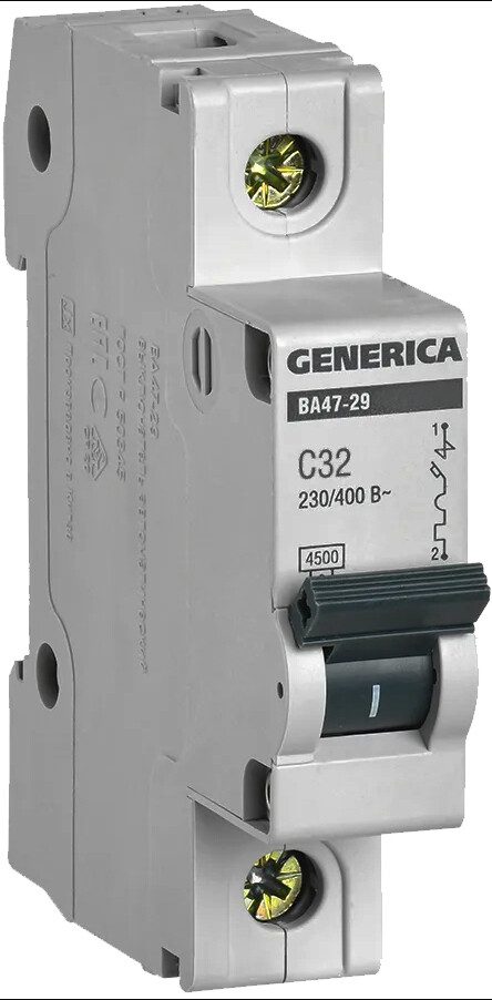 Автоматический выключатель GENERICA ВА47-29 1Р 32А С 4,5кА предназначен для защиты распределительных и групповых цепей, имеющих различную нагрузку: – электроприборы, освещение – выключатели с характеристикой В, – двигатели с небольшими пусковыми токами (компрессор, вентилятор) – выключатели с характеристикой C, – двигатели с большими пусковыми токами (подъемные механизмы, насосы) – выключатели с характеристикой D. Автоматические выключатели ВА47-29 рекомендуются к применению в вводно-распределительных устройствах для жилых и общественных зданий. Усовершенствованная дугогасительная система: увеличенный срок службы, повышенная устойчивость к токам короткого замыкания. Возможность одновременного присоединения шиной FORK и гибким проводником для распределения питания цепи через верхние зажимы, а также возможность соединения шиной PIN. Наличие индикатора положения контактов. Широкий диапазон рабочих температур от -40 до +50 °С. Новый эргономичный дизайн рукоятки включения/выключения. Насечки на контактных зажимах снижают тепловые потери и увеличивают механическую устойчивость соединения.