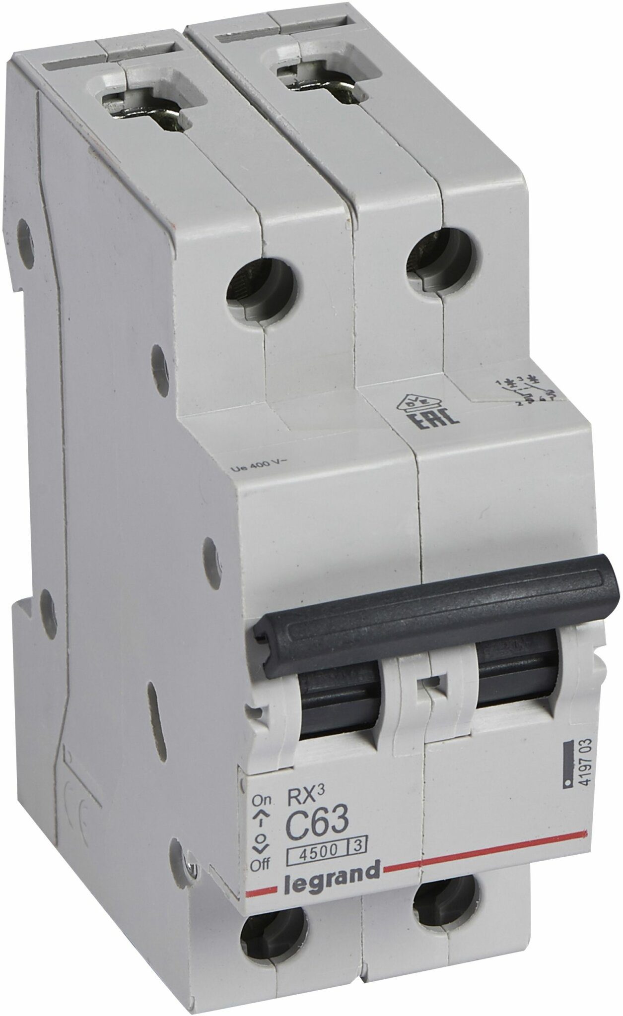 Автоматический выключатель LEGRAND RX3 4500 2P 63А С 4,5кА (419703) выполняет защиту установок от перегрузок и коротких замыканий, обеспечивая их надежную и безопасную эксплуатацию.