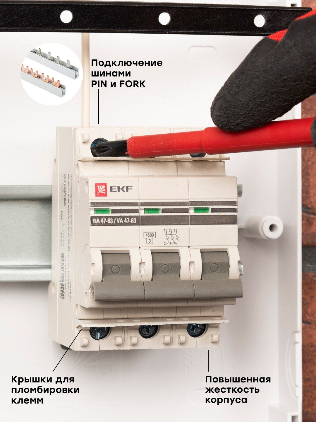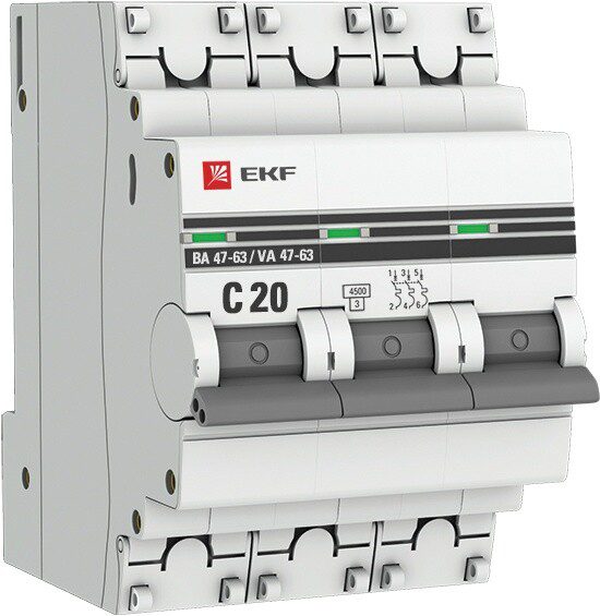 Автоматический выключатель EKF PROxima ВА 47-63 3P 20А C 4,5кA (mcb4763-3-20C-pro) является механическим коммутационным аппаратом и соответствуют ГОСТ Р50345-2010. Особенностью данной серии выключателей является усовершенствованная конструкция. В выключателе имеются пластиковые крышки, закрывающие доступ к винтовому зажиму и служащие для опломбирования выключателя, что исключает несанкционированный доступ к проводникам. Корпус выключателя усилен дополнительными заклепками для устранения эффекта расхождения корпуса. Выключатель оборудован удобной ручкой управления, обеспечивающей надежное оперирование изделием. На лицевой панели выключателя имеется цветовой индикатор состояния. Конструкция установочного зажима обеспечивает свободную установку выключателя на DIN-рейку.