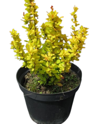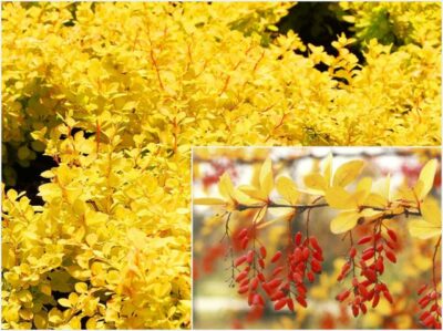 Ветвистый кустарник высотой до 120см. Ширина растения – 1-1,2 м. Корневая система мочковатая. Подземные побеги залегают на небольшой глубине. Барбарис Тунберга Ауреа многоствольный – по 15-20 центральных побегов на каждом кусте. На стеблях большое количество побочных ветвей, формирующих широкую крону. Присутствуют острые колючки. Молодые барбарисы округлые. По мере роста крона деформируется. Для сохранения декоративности ветви подрезают. В начале весны крона салатового цвета. Позже листья приобретают лимонный и золотистый окрас. Осенью крона бронзовая. Растение сохраняет декоративность до первых заморозков. Зимой листва опадает, но на ветвях созревают яркие ягоды.