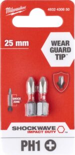 Бита для шуруповерта ударная PH1 25 мм 2 штуки MILWAUKEE Shockwave (4932430850) идеально подходит не только для работ импульсным гайковертом, но для любых видов работ по сверлению и закручиванию. Геометрия Shock Zone разработана для Flex. Shock Zone уменьшает давление на наконечник насадки и снижает риск поломки. Дизайн Shock Zone и специальная термообработка поглощают удары и делают насадку более эластичной. Компрессионный кованый наконечник обеспечивает отличную посадку в головку винта.