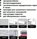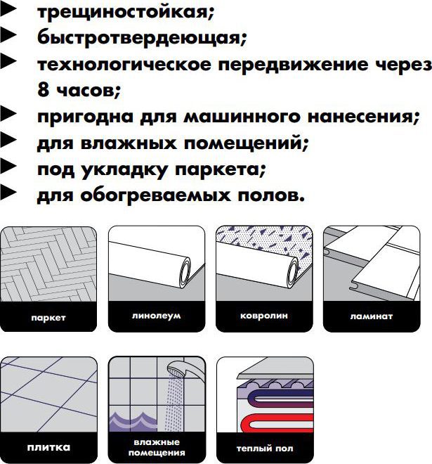 | Готовность к дальнейшим работам | устройство покрытий из керамической плитки — через 48 часов, с использованием клеев: на водной основе — через 72 часа, на органических растворителях — через 7 суток |