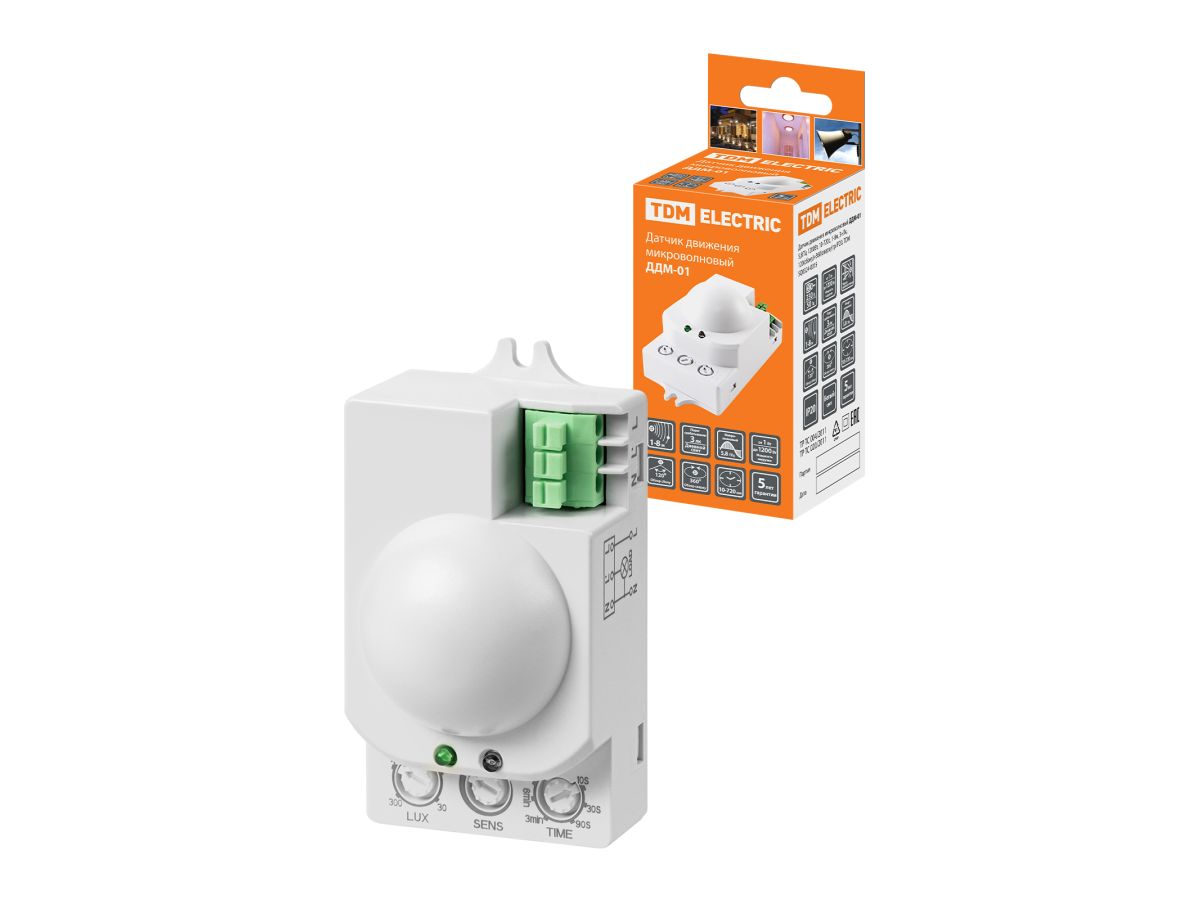 Датчик движения микроволновый настенный TDM ДДМ-01 (SQ0324-0015) Применяется для управление уличным и внутренним освещением, электроприборами, устройствами сигнализации и др.