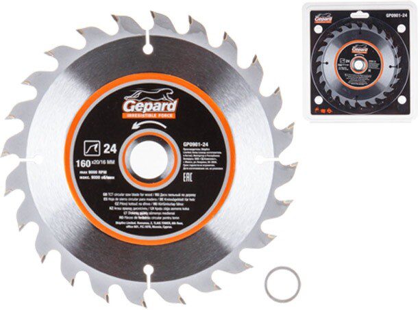 Диск пильный 160х20/16 мм 24 зуба GEPARD (GP0901-24) для распиловки заготовок из мягких и твердых пород древесины, фанеры, ДСП. Изготовлен пильный диск из пружинной стали марки 65MN. Форма зуба (ATB) с положительным углом наклона обеспечивает эффективную распиловку крупных заготовок. Твердосплавные напайки из сплава карбид вольфрама (YG6X) припаяны высокопрочным припоем. Алмазная заточка с выхаживанием значительно увеличивает срок службы инструмента. Тщательно подобранный угол заточки твердосплавных зубьев позволяет производить качественные и высокопроизводительные работы по распиловке древесины. Компенсационные прорези уменьшают колебания, подавляют шумы и препятствуют изгибанию диска при нагреве. Посадка 20/16 мм с переходным кольцом в комплекте. Упаковка: индивидуальный блистер с отверстием под крюк.