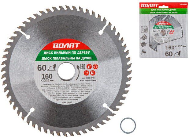 Диск пильный 160х20/16 мм 60 зубьев ВОЛАТ по дереву (88120-60) предназначен для продольного и поперечного распила древесины. Корпус диска шлифованный, изготовлен из стали 65Г и термонормализован. Форма зуба (ATB) с положительным углом наклона. Посадка 20/16 мм с переходным кольцом в комплекте. Подходит для точного и чистого пиления древесины мягких и твердых пород, ДСП, МДФ и фанеры.