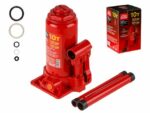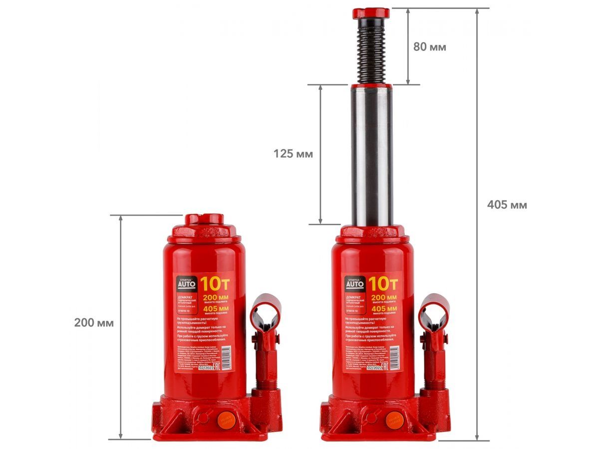 Домкрат гидравлический бутылочный 10 т STARTUL Auto (ST8018-10) — гидравлический бутылочный домкрат представляет собой устройство с ручным приводом, предназначенное для поднятия и фиксации грузов. Домкраты данного типа могут использоваться в качестве рабочего элемента в более сложных устройствах, таких как прессы, трубогибы, подъемники. Домкраты оснащены специальным предохранительным клапаном, обеспечивающим защиту от перегрузки, и не позволяющим поднятия веса более допустимого. Основание — чугун. Корпус — сталь.