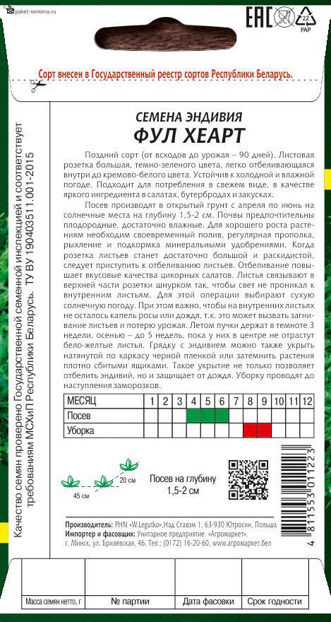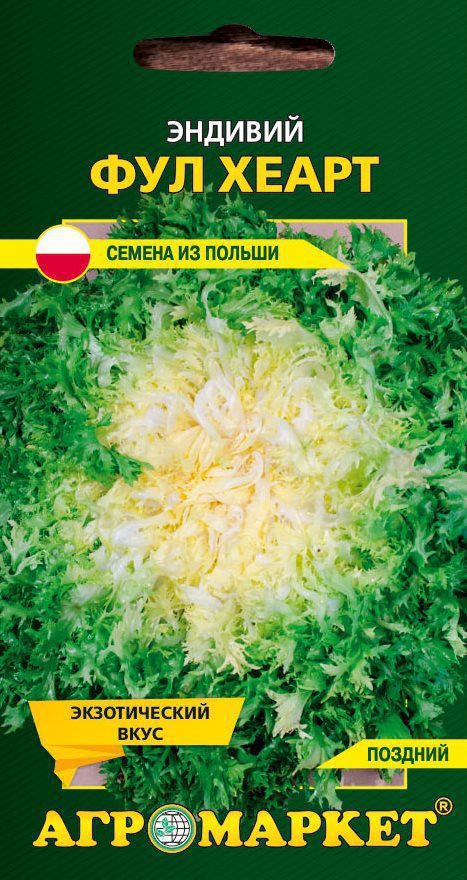 Семена эндивий Фул Хеарт LEGUTKO 0,5 г (30309) — поздний сорт (от всходов до урожая – 90 дней). Листовая розетка большая, темно-зеленого цвета, легко отбеливающаяся внутри до кремово-белого цвета. Устойчив к холодной и влажной погоде. Подходит для потребления в свежем виде, в качестве яркого ингредиента в салатах, бутербродах и закусках.Посев производят в открытый грунт с апреля по июнь на солнечные места на глубину 1,5-2 см. Почвы предпочтительны плодородные, достаточно влажные. Для хорошего роста растениям необходим своевременный полив, регулярная прополка, рыхление и подкормка минеральными удобрениями. Когда розетка листьев станет достаточно большой и раскидистой, следует приступить к отбеливанию листьев. Отбеливание повышает вкусовые качества цикорных салатов. Листья связывают в верхней части розетки шнурком так, чтобы свет не проникал к внутренним листьям. Для этой операции выбирают сухую солнечную погоду. При этом важно, чтобы на внутренних листьях не осталось капель росы или дождя, т.к. это может вызвать загнивание листьев и потерю урожая. Летом пучки держат в темноте 3 недели, осенью – до 5 недель, пока у них в центре не отрастут бело-желтые листья. Грядку с эндивием можно также укрыть натянутой по каркасу черной пленкой или затемнить растения плотно сбитыми ящиками. Такое укрытие не только позволяет отбелить эндивий, но и защищает от дождя. Уборку проводят до наступления заморозков.