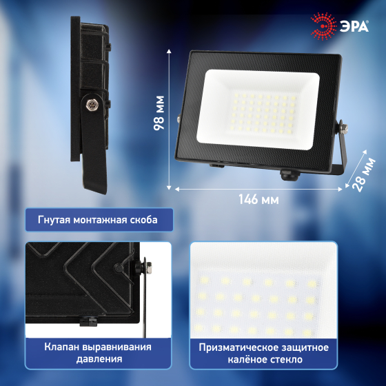 Главная Освещение Прожекторы ЭРА LPR-062-0-65K-030 Прожектор светодиодный уличный PRO 30Вт 6500К 3000лм IP65 призма