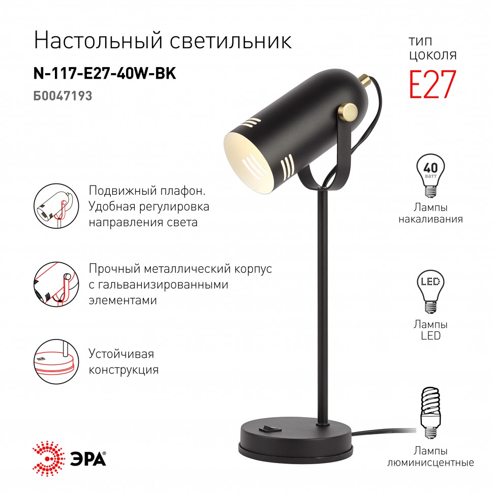 Красивый и удобный настольный светильник ЭРА N-117-Е27-40W-ВК в стильном «ретро» корпусе. Может использоваться с разными источниками света — лампой накаливания, компактной люминесцентной лампой (КЛЛ) или светодиодной (LED) лампой. Прочный металлический корпус украшен гальванизированными элементами. Подвижный плафон позволяет регулировать направление света. В числе преимуществ для комфортного использования — устойчивость конструкции и оптимальные размеры для размещения на столе. Трендовый дизайн и актуальное сочетание цветов (бежевый корпус с матовыми золотистыми деталями) сделают этот светильник изюминкой интерьеров, особенно в стиле лофт или минимализм.