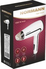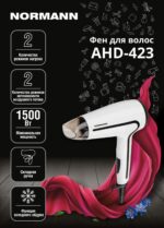 Фен NORMANN AHD-423 имеет складную ручку, благодаря чему его удобно брать в путешествия. Наличие 2-х скоростей (режимов нагрева) и функции холодного обдува. Для удобства хранения прибора предусмотрена петелька для подвешивания. Съемный фильтр-сетка на входе. Насадка-концентратор в комплекте.