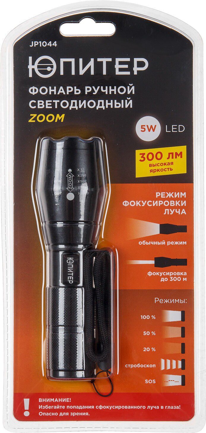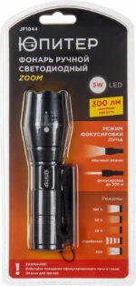 Фонарь светодиодный ЮПИТЕР ZOOM 5Вт 3хAAA (JP1044) имеет надежный алюминиевый сплав (защищает фонарик от практически любых механических повреждений). Применение в конструкции особо мощного светодиода и специальной передвижной линзы позволяет добиться фокусировки луча на расстояние до 300 м. Наличие шнурка-подвеса обеспечивает дополнительное удобство пользования. Источник питания: 3хAАA (элементы питания в комплект не входят). Режимы работы: 100% яркости, 50% яркости, 20% яркости, стробоскоп, SOS.