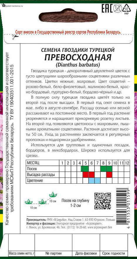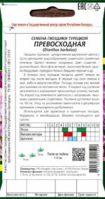 Семена гвоздики турецкой Превосходная LEGUTKO 0,2 г (30365) — декоративный двухлетний цветок с густо цветущими шарообразными соцветиями различных оттенков. Цветки нежные, махровые. Цвет соцветий – розово-белый, бело-фиолетовый, малиново-белый, красно-бордовый, пурпурно-белый, бордово-чёрный и др.В полную силу турецкая гвоздика цветёт только на второй год после высадки. В первый год сеют семена в мае, либо в августе-сентябре. Рассаду осенью или весной рассаживают на постоянное место. В первый год растение укореняется и наращивает прикорневую розетку листьев. На второй год появляются цветоносы с махровыми, пышными ароматными соцветиями. Растения достигают высоты 50 см. Уход за растениями заключается в регулярных прополках и подкормках удобрениями.Используется для групповых и одиночных посадок, бордюров, в миксбордерах. Широко используется для срезки.