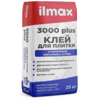 Клей для плитки ILMAX 3000 25 кг предназначен для приклеивания керамической плитки размером до 45×45 см, керамической мозаики, а также цементных, бетонных плиток толщиной не более 10 мм. Используется на жестких (недеформируемых) впитывающих основаниях из следующих материалов: бетон; цементные и цементно-известковые штукатурки; кирпич и блоки из ячеистого бетона; цементные стяжки.Рекомендуется для облицовки горизонтальных и вертикальных поверхностей санузлов, душевых, ванных комнат, кухонь и прихожих. Может применяться для облицовки крытых вертикальных поверхностей снаружи зданий и в помещениях с низкими температурами, где поверхность не подвержена воздействию воды.Марка по консистенции К1, группа по сохраняемости консистенции St-4: РСС.
