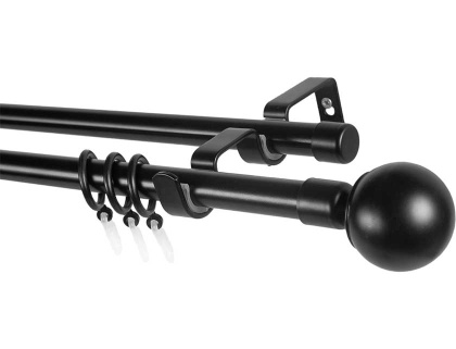 Карниз для штор настенный двухрядный LM DECOR Лайт Сфера 19/19 мм 2,0 м черный матовый — практичный и универсальный вариант подвеса гардин. Модель монтируется на стену. Высококачественный металл карниза обработан специальным антикоррозийным составом, что позволяет ему служить долгие годы. Лаконичные круглые наконечники будут органично смотреться в любом интерьере. Длина карниза указана без учета размеров навесных элементов. Изделие комплектуется двумя штангами для штор, настенными кронштейнами, наконечниками, пластиковыми облегченными кольцами с крючками и заглушками для второго ряда.