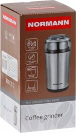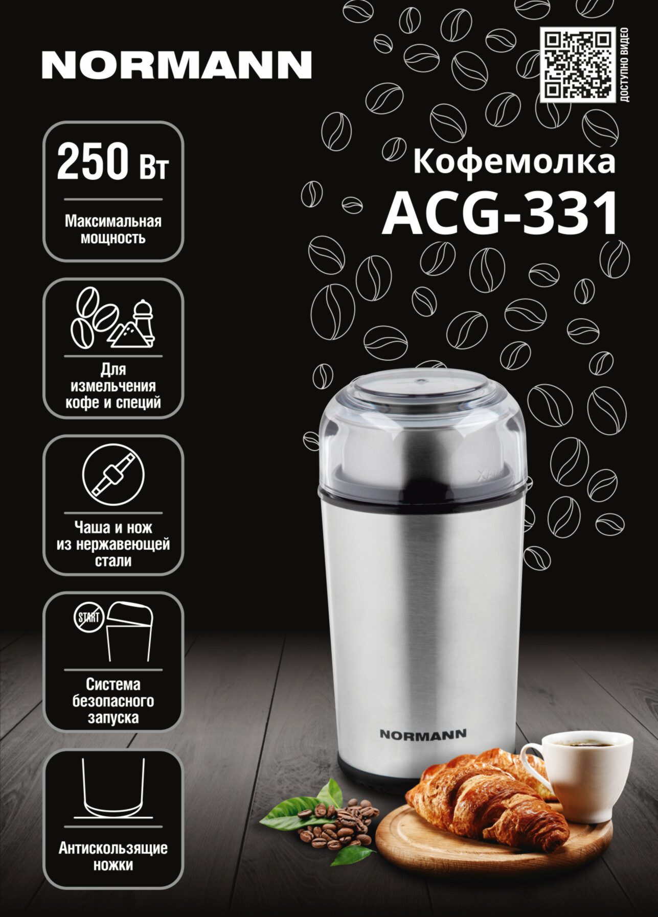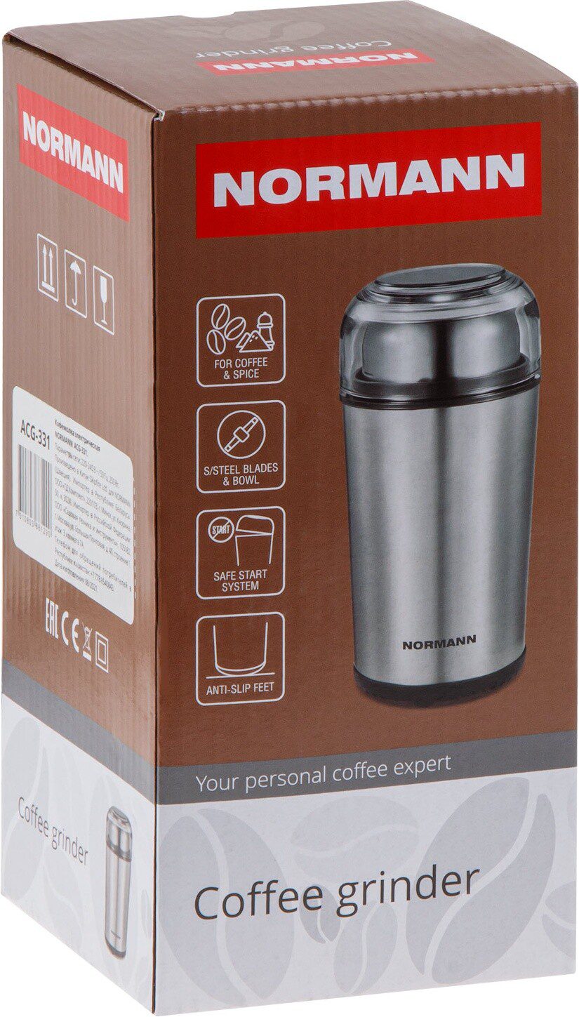Кофемолка NORMANN ACG-331 используется для измельчения кофе и специй. Крышка выполнена из прозрачного пластика. Чаша и нож изготовлены из нержавеющей стали. Чаша съемная. В комплекте идет щеточка для очистки. Максимальная вместимость контейнера для зерен — 100 г.