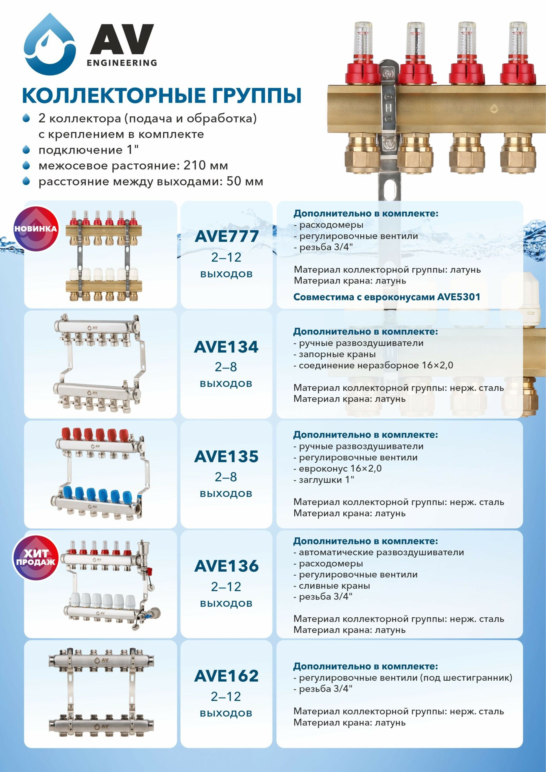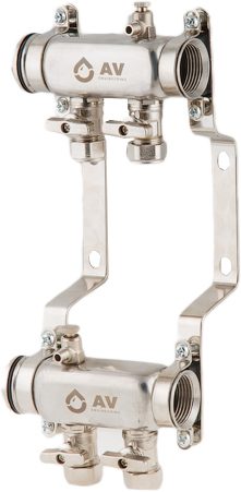 Коллекторная группа AVE134, 2 выхода AV Engineering (AVE13400102) предназначена для распределения и регулировки систем теплого пола. Материал изготовления коллектора — нержавеющая сталь. Гарантия на комплектующие — 1 год. Подключение 1″.