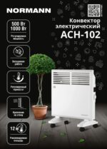 Конвектор NORMANN ACH-102 служит для обогрева помещений площадью до 12 м2. Тихая работа. У прибора нет вентилятора, поэтому он не гудит. Модель снабжена колёсиками для передвижения по полу и кронштейном для крепления к стене. Ручка термостата позволит постоянно поддерживать в комнате комфортную температуру. Двухрежимный выключатель ‒ режим экспресс-нагрева и экономичный режим. Прибор оснащен защитой от опрокидывания и перегрева. Длина электрического провода: 1,3 м. Степень защиты: IPX0.
