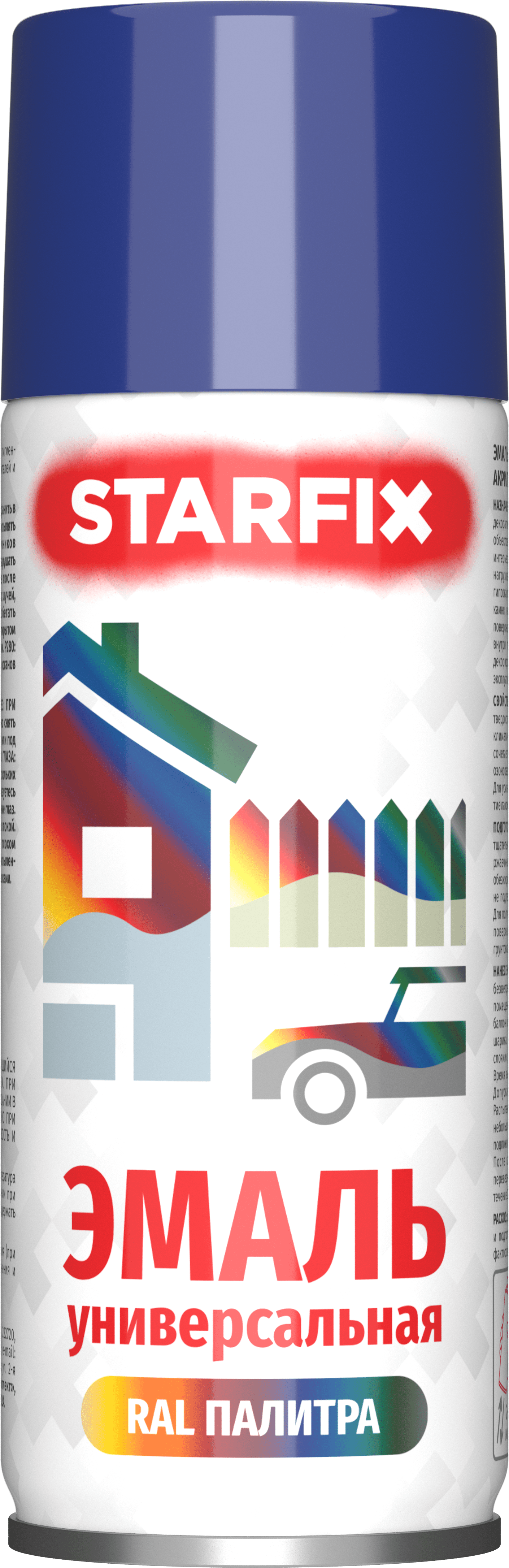Краска-эмаль аэрозольная универсальная темно-синий 5002 STARFIX 520 мл (SM-99030-1) применяется для быстрого и равномерного окрашивания, декоративного оформления и ремонта небольших по размеру объектов и бытовых изделий, элементов ландшафтного, интерьерного дизайна, не подвергающихся механическим нагрузкам. Рекомендуется нанесение по плотным минеральным поверхностям: бетонным, кирпичным, оштукатуренным, гипсокартонным, из искусственного и натурального камня, неглазурированной керамики, щебня; по металлическим поверхностям, в т. ч. окрашенным ранее порошковыми красками (наружные стенки холодильников, стиральных машин, микроволновых печей и т.п.), по натуральным плотным тканям (плакаты, элементы одежды), эксплуатирующимся в атмосферных условиях и внутри помещений. Возможно применение для окраски и декорирования изделий из древесины (элементы мебели, рамки для фото, окна, двери, и др., кроме полов) и стекла, эксплуатирующихся внутри помещений.
