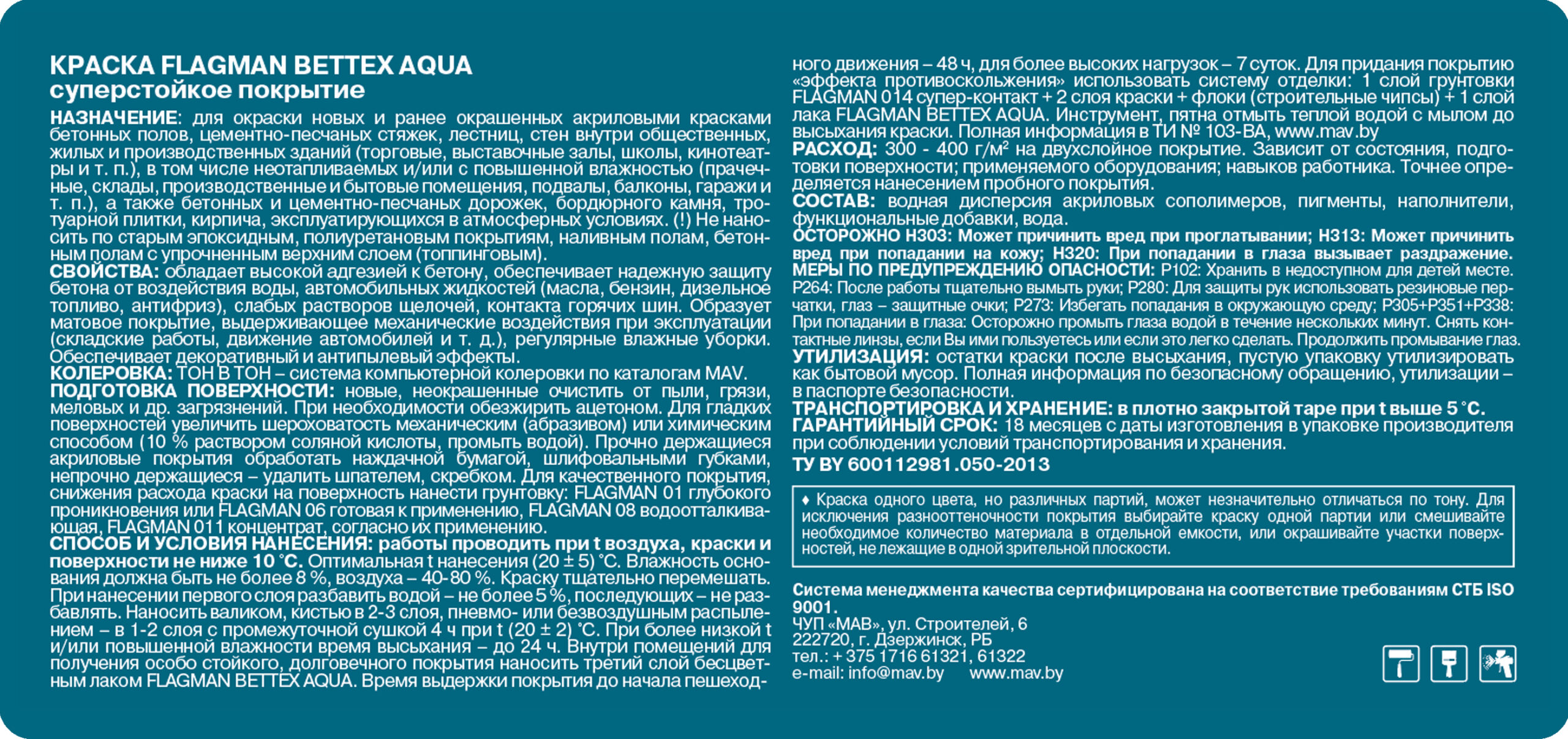 Краска FLAGMAN BETTEX AQUA предназначена для применения на объектах гражданского и промышленного строительства, в том числе пищевой промышленности; для создания защитно-декоративного покрытия на минеральных полах и стенах внутри зданий (I-IV классов) различного функционального назначения и функциональной пожарной опасности (Ф1-Ф5); рекомендуется для окраски бетонных полов, цементных стяжек, лестниц и стен в отапливаемых и неотапливаемых общественных, жилых и производственных зданиях и сооружениях (торговые и выставочные центры, учебные заведения, организации здравоохранения, культовые сооружения, предприятия пищевой промышленности и т.д.), в том числе с повышенной влажностью (прачечные, склады, производственные и бытовые помещения, подвалы, балконы, гаражи и т.д.), подвергающихся умеренным механическим нагрузкам и/или воздействию агрессивных жидкостей (горюче-смазочных материалов, дезрастворов и т.д.), а также для окраски бетонных и цементно-песчаных дорожек, бордюрного камня, тротуарной плитки, кирпича, эксплуатирующихся в атмосферных условиях, с целью защиты от пыления, умеренных механических нагрузок, а также от воздействия воды, автомобильных жидкостей, горячих шин.