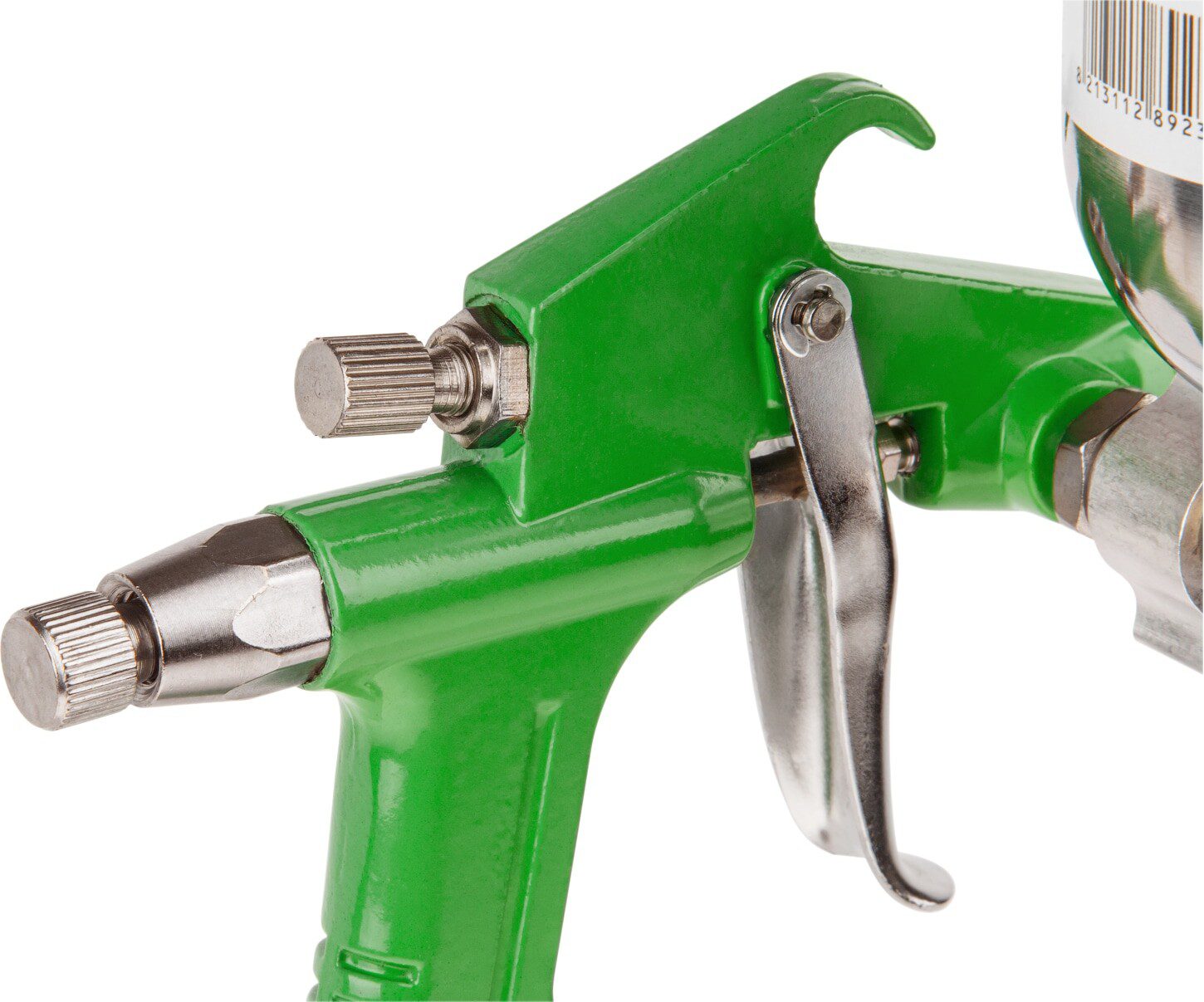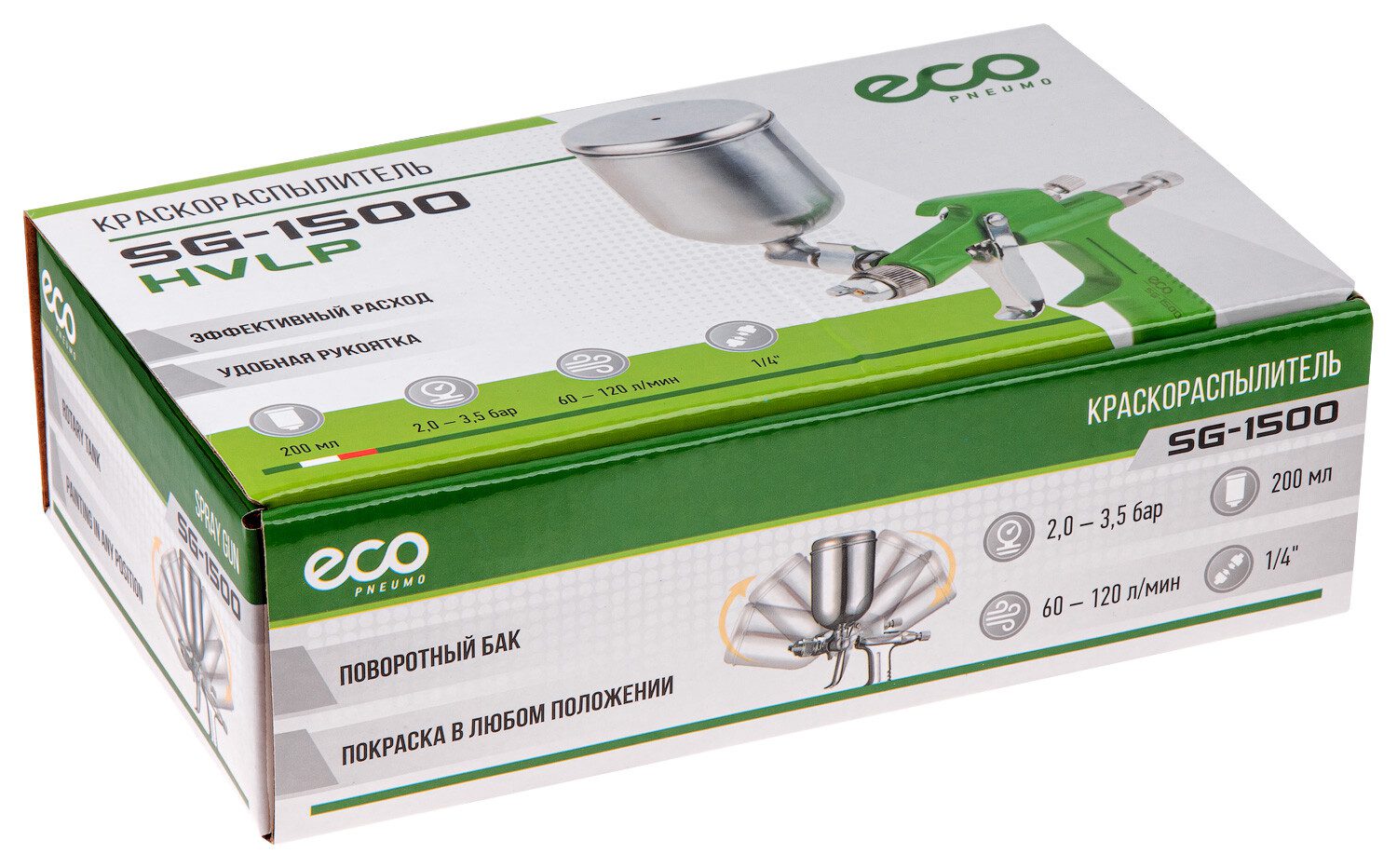 Краскопульт пневматический ECO SG-1500 (EC1530-10) — это компактный краскораспылитель типа HVLP с поворотным металлическим бачком разработан для работ в труднодоступных местах. За счет изменения положения бачка материал можно наносить на поверхности в разных плоскостях.