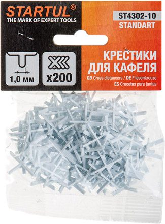 Крестики для укладки плитки 1 мм 200 штук STARTUL Standart (ST4302-10) используются для получения одинаковых и ровных швов. После заполнения затиркой, такие швы усиливают визуальный эффект уложенной плитки. Крестики позволяют визуально выравнивать скосы на лицевой стороне плитки и получать ровные швы с одинаковым расстоянием между краями плиток.