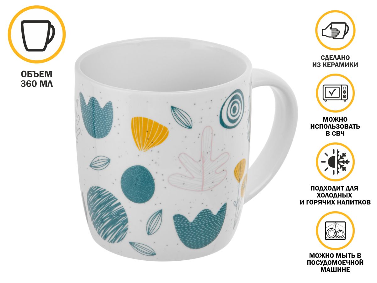 Кружка керамическая PERFECTO LINEA Fantasy-3 360 мл (30-250503) — подходит для подачи горячих и холодных напитков. Керамика отличается высокой экологичностью. Допускается применение при любой температуре: холодильник, разогрев в микроволновой печи. Неустойчива к перепадам температуры. Можно мыть в посудомоечной машине.