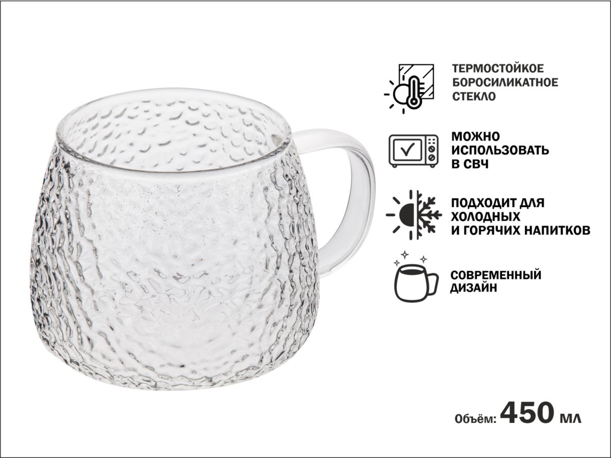Боросиликатное стекло устойчиво к высоким температурам, не мутнеет со временем и сохраняет вкус напитков. Кружку можно безопасно мыть в посудомоечной машине и использовать в микроволновой печи.