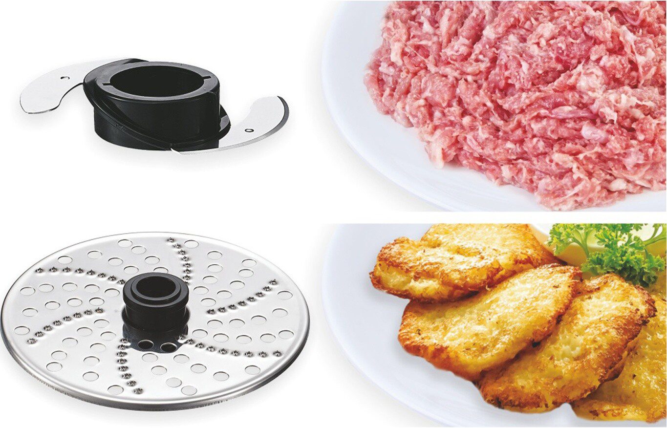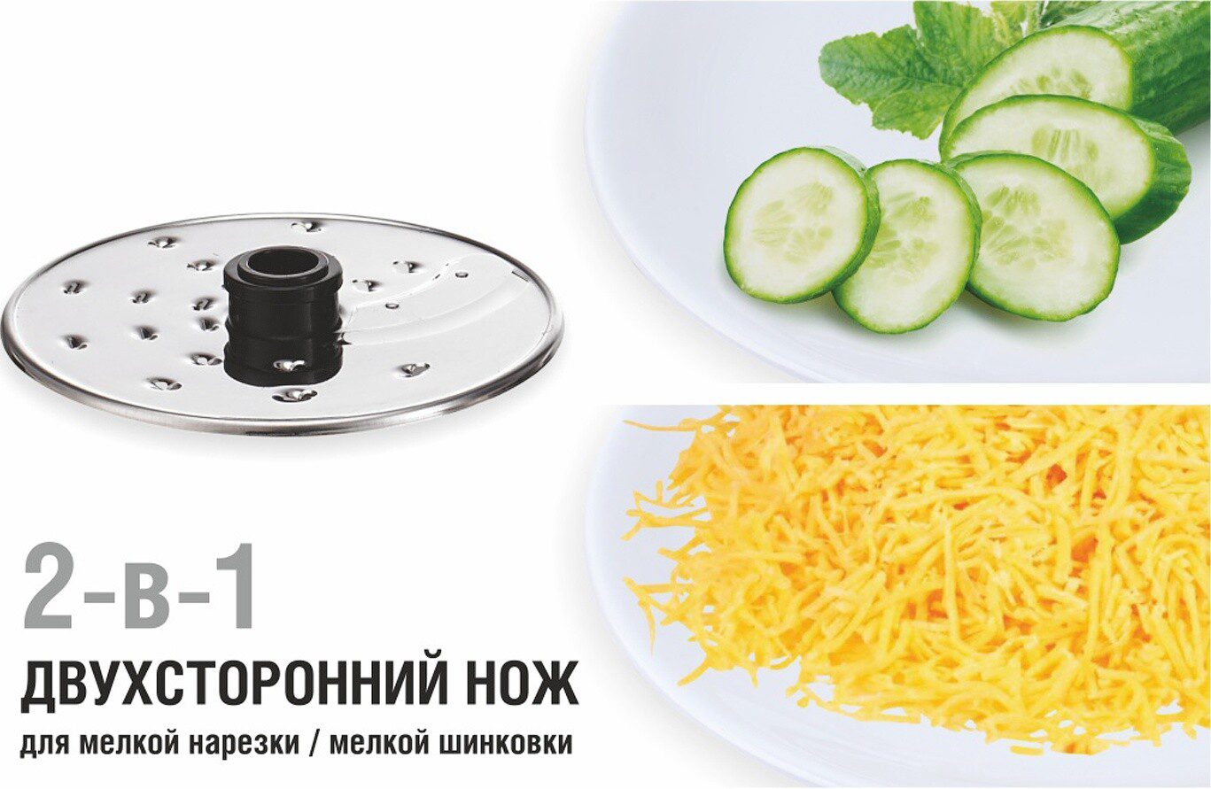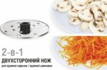 | Терка, Терка для драников, Насадка для нарезки ломтиками, Универсальный нож, Насадка для взбивания, Насадка для теста, Насадка-эмульгатор | |