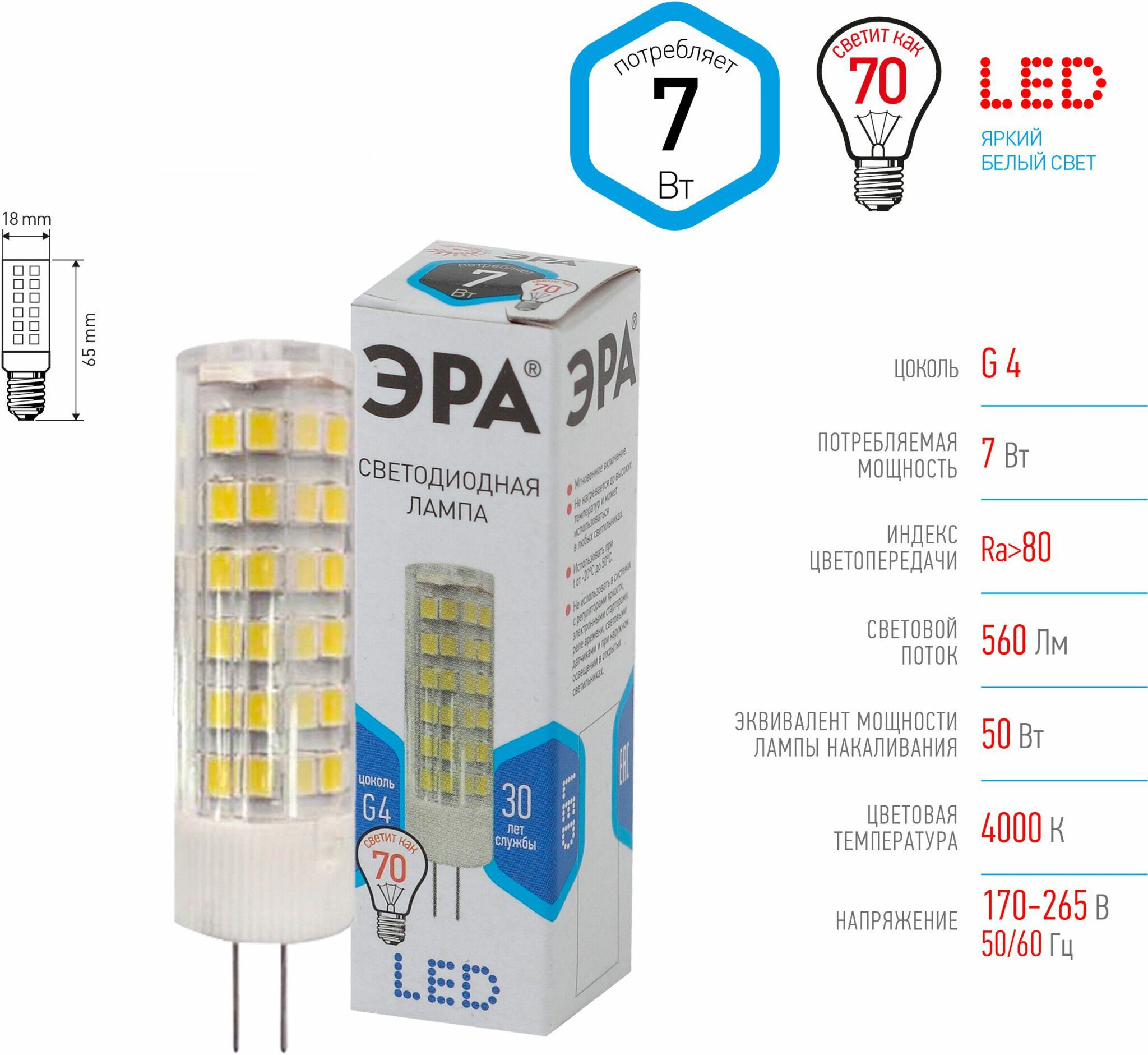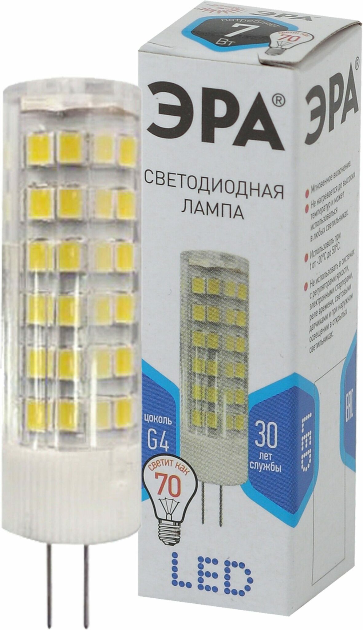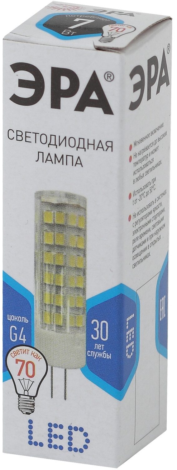 Лампа светодиодная G4 ЭРА ceramic-840 STD JC 7 Вт создает яркое ровное освещение и экономит до 90% электроэнергии по сравнению с лампой накаливания с аналогичным световым потоком. Светит теплым светом с желтым оттенком — такая цветовая температура эффективна для отдыха и уютной атмосферы в доме. Используется в потолочных, настенных, настольных светильниках, в люстрах и бра. Мгновенно включается и не нагревается.