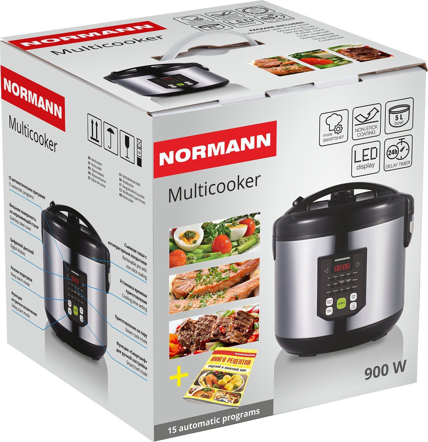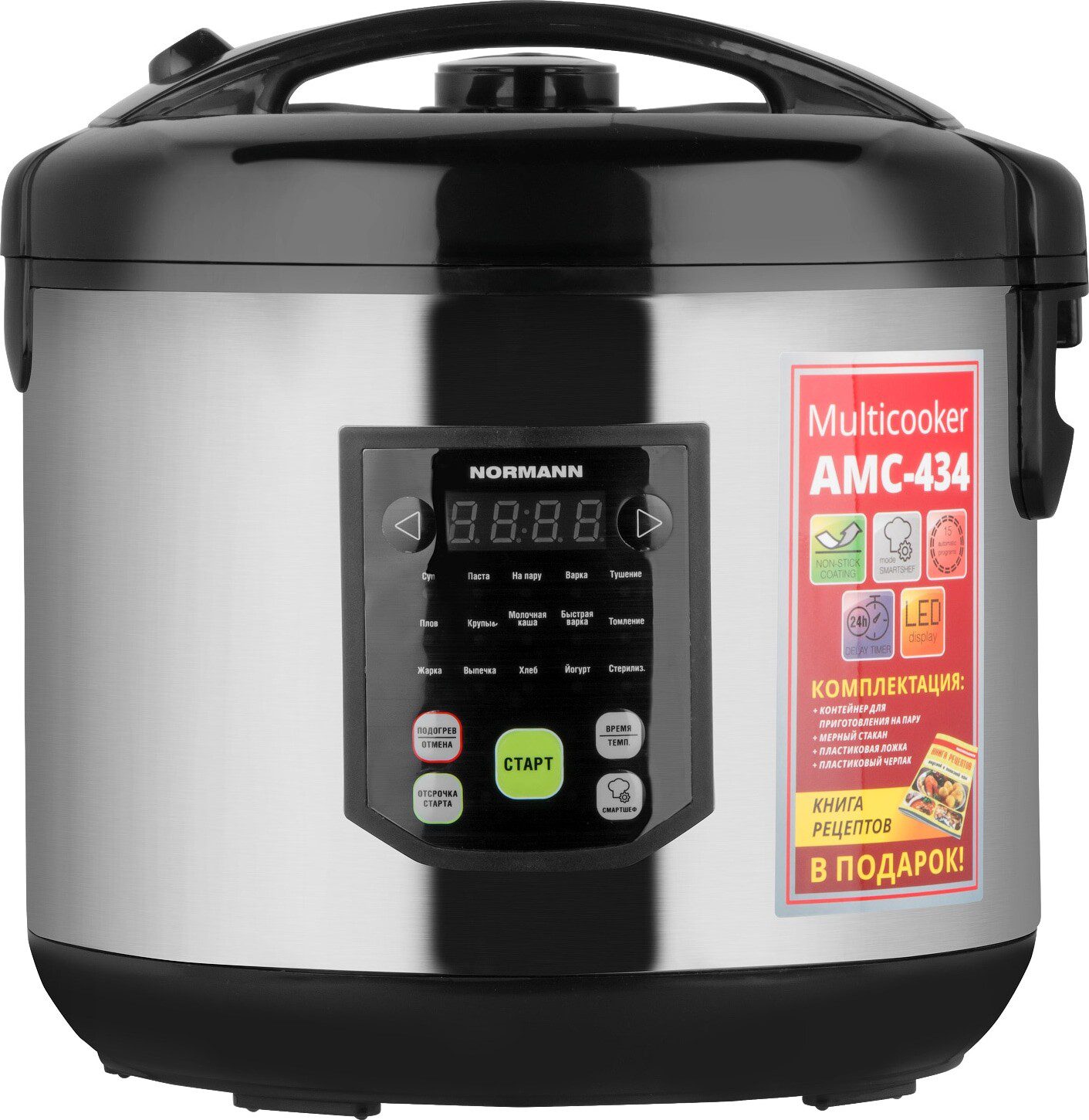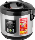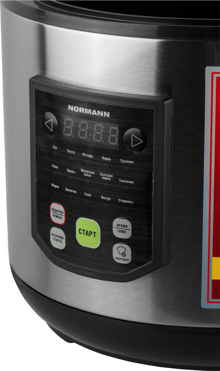 Мультиварка NORMANN AMC-434 имеет 15 автоматических программ. Функция СМАРТШЕФ позволяет настроить режим приготовления вручную. Внешняя поверхность прибора выполнена из нержавеющей стали. Съемная чаша 5 литров с антипригарным покрытием. Функция приготовление на пару. Книга рецептов в комплекте.