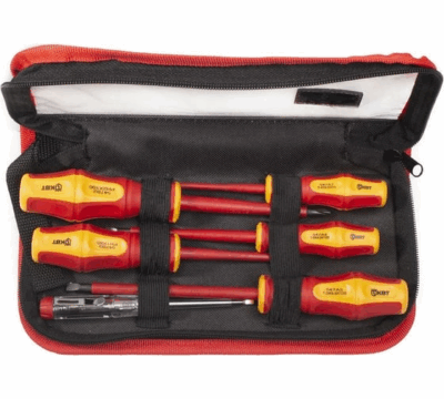 Набор отверток диэлектрических КВТ Профи НИО-06-S 6 предметов (87129) предназначен для проведения электромонтажных работ под напряжением до 1000 В. Стержни выполнены из высокопрочной стали S2. Имеется намагниченный наконечник. Двухкомпонентные эргономичные рукоятки с мягкими прорезиненными вставками. Маркировка на торце рукояток с обозначением типа профилей. Специальная форма рукояток, не позволяющая инструменту скатываться с наклонной поверхности.