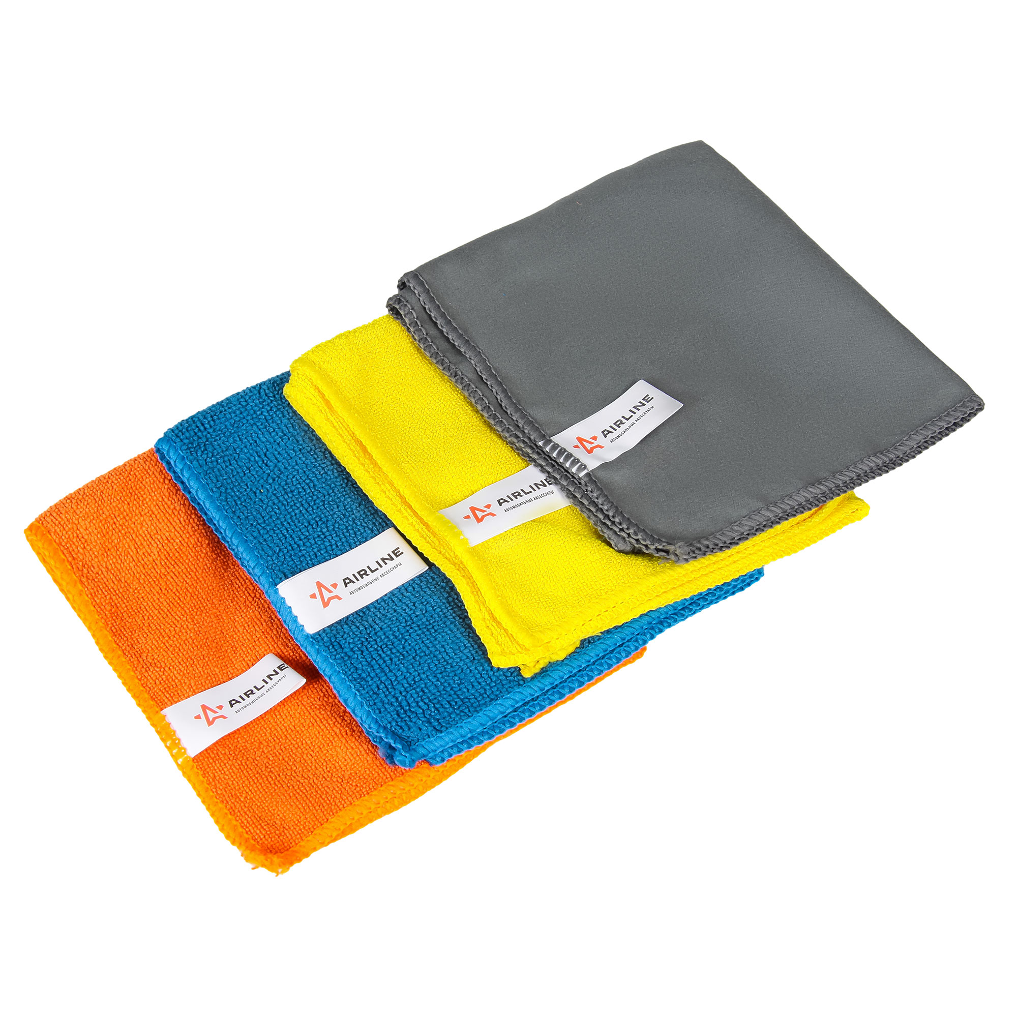 В комплект входят: 3 салфетки из микрофибры оранжевого, синего и желтого цветов; 1 двухсторонняя салфетка из микрофибры серого цвета.