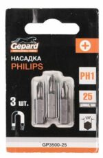 Бита для шуруповерта магнитная PH1 25 мм 3 штуки GEPARD (GP3500-25) применяется в качестве сменной насадки для работы с крепежом с крестовым шлицем стандарта Philips.