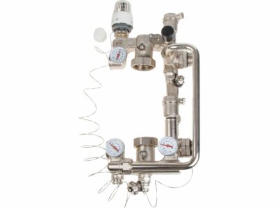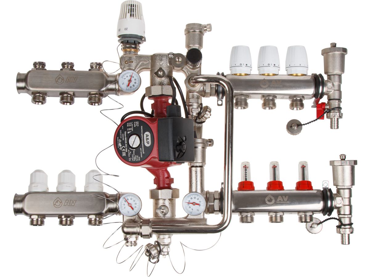 Насосно-смесительная группа AV Engineering предназначена для совмещения контура радиаторного отопления и водяного напольного отопления. Обеспечивает поддержание необходимой температуры и расхода теплоносителя во вторичном контуре («теплый пол») и гидравлическую увязку первичного (радиаторного) и вторичного контуров.