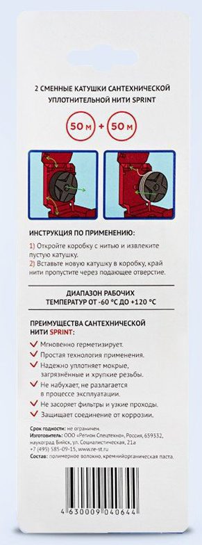 Нить для герметизации резьбовых соединений Sprint набор катушек 2х50 РЕГИОНСПЕЦТЕХНО (61013) применяется для уплотнения резьбовых соединений при монтаже труб. Подходит для герметизации водопроводных, газовых и воздуховодных труб.