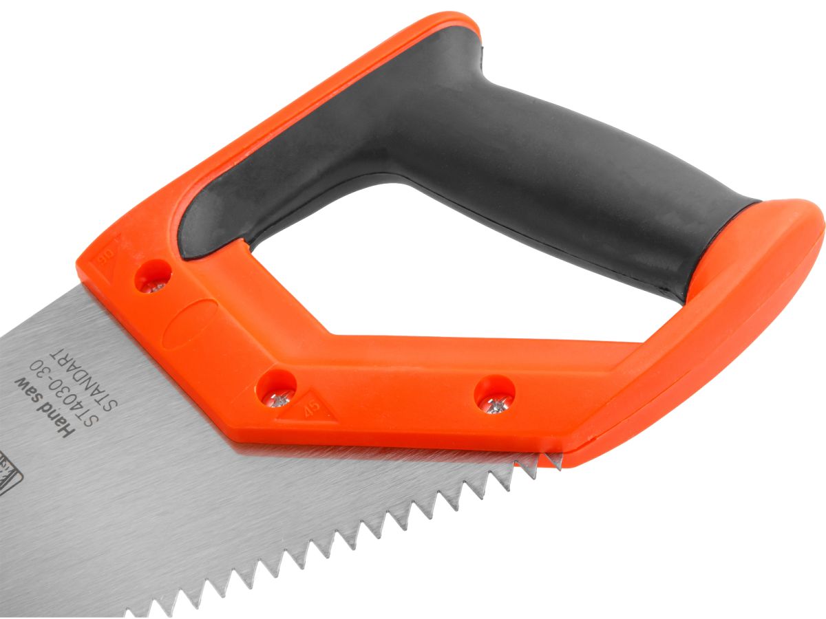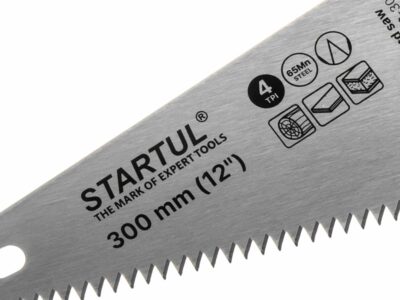 Ножовка по дереву 300 мм 4 TPI STARTUL Standart (ST4030-30) — используется при поперечном пилении древесины. Зубья без двугранной заточки. Полотно — инструментальная углеродистая сталь 65Mn. Покрытие полотна — сухое антикоррозийное масло.