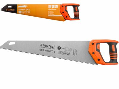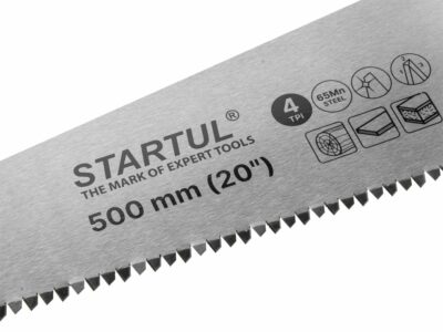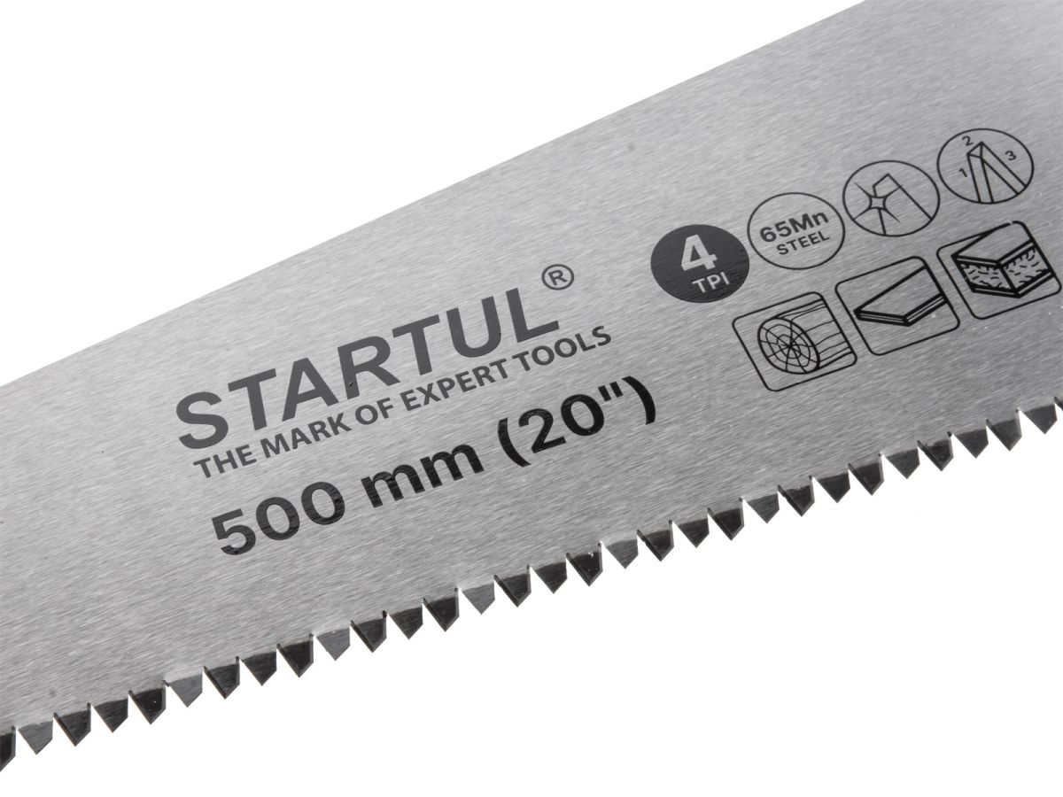 Ножовка по дереву 500 мм 4 TPI STARTUL Master (ST4240-50) предназначена для продольного и поперечного пиления древесины. У неё 4 зуба на дюйм, калёные зубья с трёхгранной заточкой, полотно из инструментальной углеродистой стали 65Mn и сухое антикоррозийное покрытие. Рукоятка двухкомпонентная, ударопрочная и обрезиненная, крепится к полотну тремя винтами.