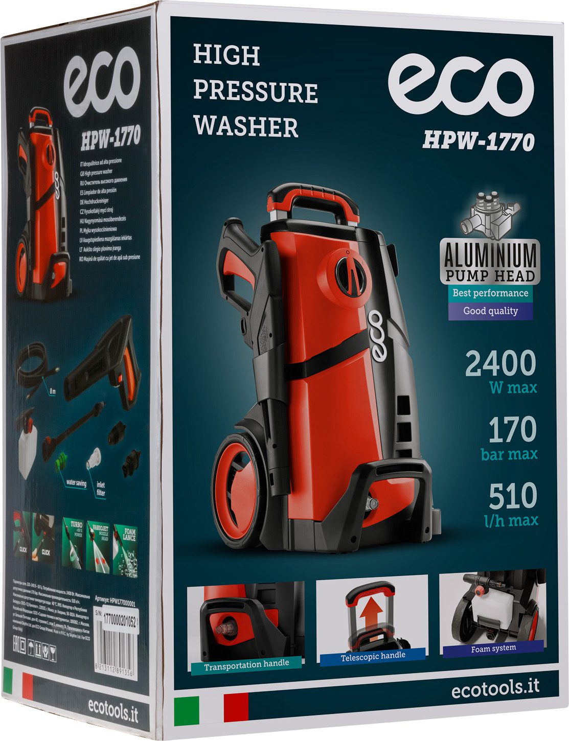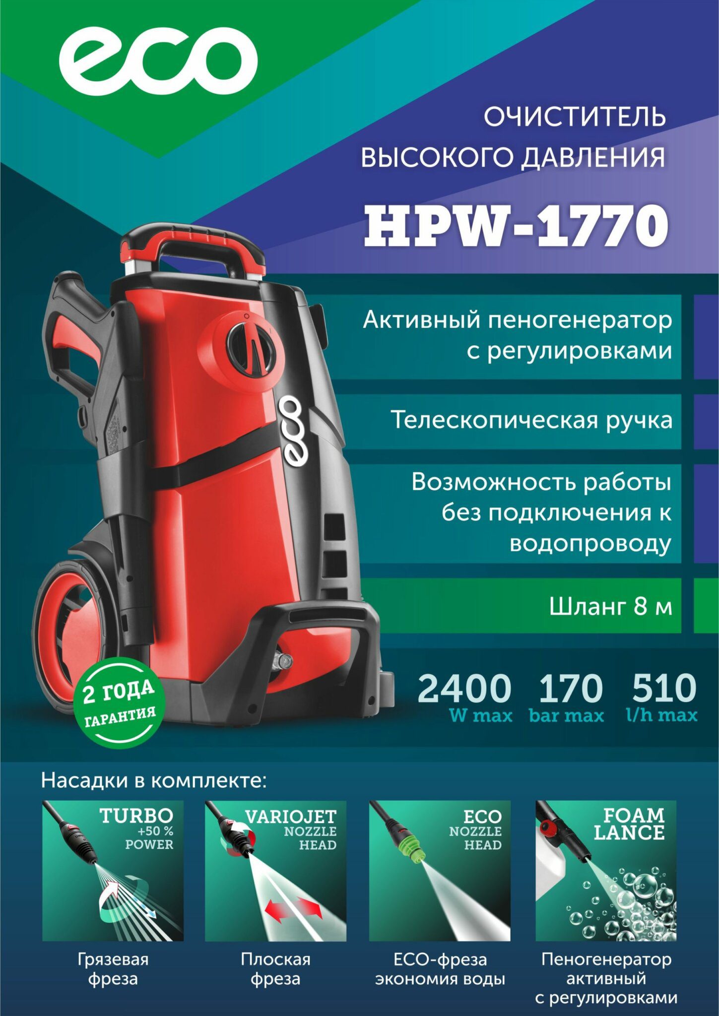 Мойка высокого давления ECO HPW-1770 (HPW177000001) предназначена для устранения загрязнений с твердых поверхностей. Послужит надежным помощником при мытье автомобиля, садовых принадлежностей, велосипеда, лестницы и пр.