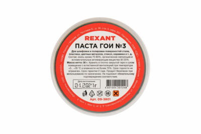 Паста ГОИ полировальная № 3 REXANT (09-3801) полировальный состав зелёного цвета с зернистостью 17–8 мкм и высоким содержанием оксида хрома (до 80%). Обеспечивает ровный блеск и чистую поверхность при обработке твёрдых материалов. Отлично подходит для промежуточного этапа шлифования и полировки.
