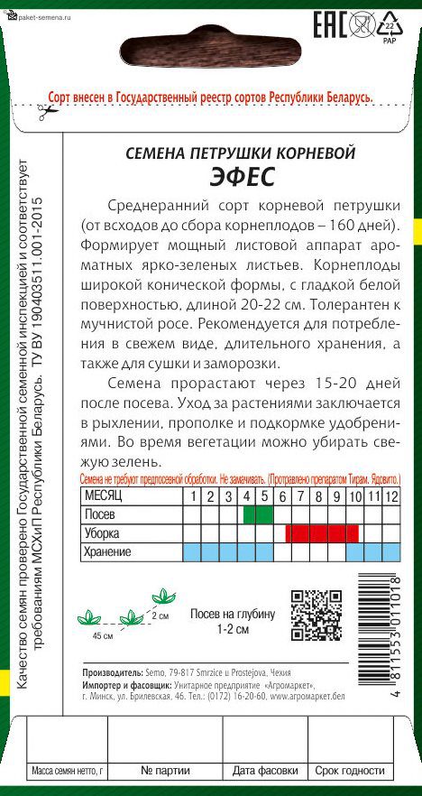Семена петрушки корневой Эфес SEMO 0,5 г (30261) — среднеранний сорт корневой петрушки (от всходов до сбора корнеплодов – 160 дней). Формирует мощный листовой аппарат ароматных ярко-зеленых листьев. Корнеплоды широкой конической формы, с гладкой белой поверхностью, длиной 20-22 см. Толерантен к мучнистой росе. Рекомендуется для потребления в свежем виде, длительного хранения, а также для сушки и заморозки. Семена прорастают через 15-20 дней после посева. Уход за растениями заключается в рыхлении, прополке и подкормке удобрениями. Во время вегетации можно убирать свежую зелень.