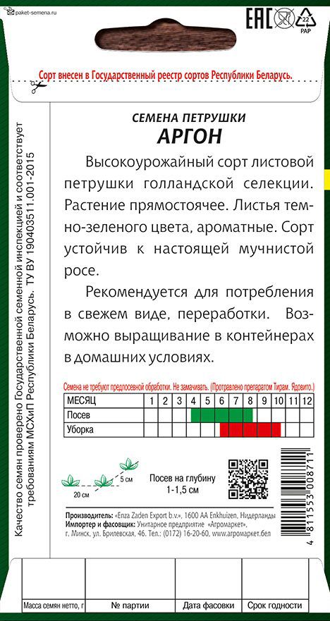 Семена петрушки листовой Аргон ENZA ZADEN EXPORT 2 г (25469) — высокоурожайный сорт листовой петрушки голландской селекции. Растение прямостоячее. Листья темно-зеленого цвета, ароматные. Сорт устойчив к настоящей мучнистой росе.Рекомендуется для потребления в свежем виде, переработки. Возможно выращивание в контейнерах в домашних условиях.Семена не требуют предпосевной обработки.