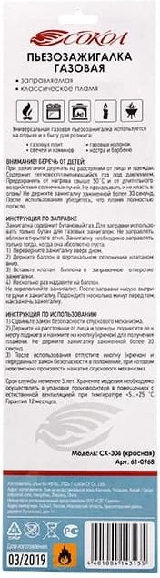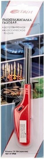 Пьезозажигалка бытовая СОКОЛ СК-306 красный (61-0968) – бытовая пьезозажигалка с классическим пламенем и держателем. Тип поджига — пьезоэлектрический. Общие габариты зажигалки: 205х38х25 мм.
