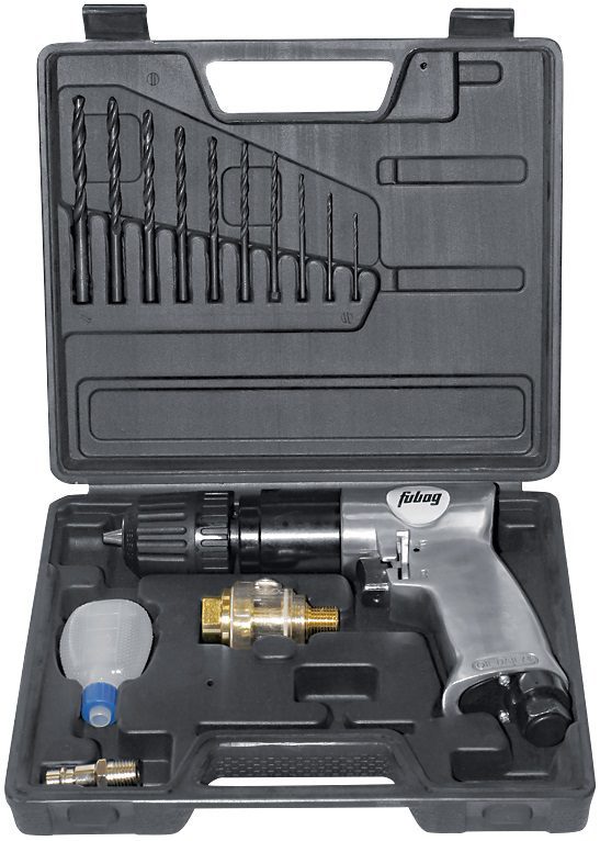 Пневмодрель FUBAG DRS1800 (100103) с реверсом подходит для интенсивных работ. Оснащена быстрозажимным патроном, что позволяет быстро производитель замену сверл. Функция реверса позволяет работать в обоих направлениях. Ударопрочный металлический корпус с эргономичной ручкой пистолетной формы. Низкий уровень шума. В комплект входит: кейс, 10 сверел 1,5-5,5 мм, штуцер, масленка, мини лубрикатор.