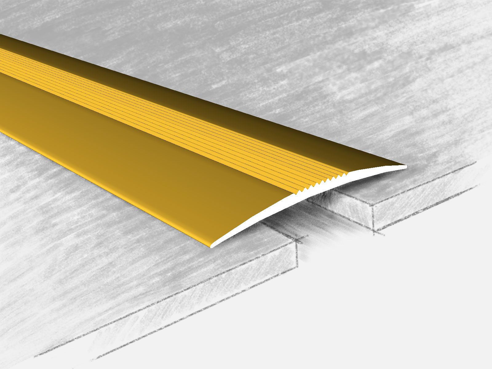 Порог алюминиевый КТМ-2000 3584-02Н 1,35 м золото — плоский профиль шириной 50 мм применяется для соединения стыков между напольными покрытиями (керамическая плитка, линолеум, ламинат, паркет). Профиль не имеет продольной жесткости, поэтому не рекомендуется применять на “мягких” покрытиях. Открытая система крепления. Степень нагрузки: для общественных помещений, для офисных помещений, для жилых помещений.